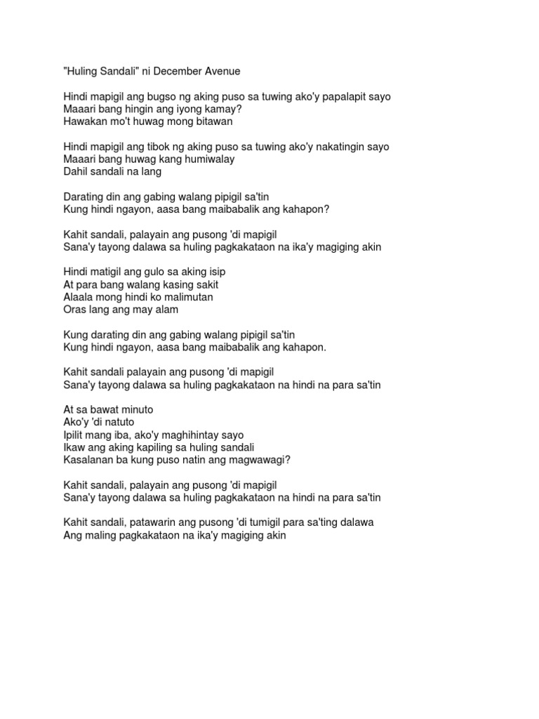 043865Kahit sandali palayain ang pusong di mapigil 045066Sanay tayong dalawa sa huling pagkakataon na hindi na para satin. Hawakan mot huwag mong bitawan Hindi mapigil ang tibok ng aking puso Sa tuwing akoy nakatingin sayo Maaari bang huwag kang humiwalay Dahil sandali na. Patawarin ang pusong di tumigil.