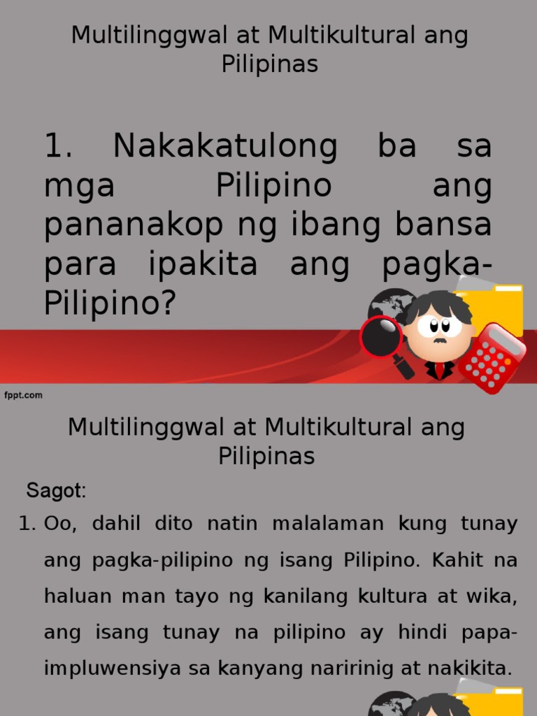 Dahil ang isipan ng natin ay nakapadron pa rin na ang Tagalog at Filipino ay iisa lamang. Ilang wika mayroon ang pilipinas na may kani kaniyabg kultura tradisyon at relihiyon. 1 on a question ang pilipinas ay isang multilinggwal at muliticulutural na bansa.