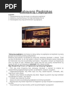 ANO ANG SABAYANG PAGBIGKAS. Sa ganitong pagtatanghal limitado lamang ang gawainkilos ng koro maliban sa pagbibigay damdamin sa pamamagitan ng angkop na tinig ekspresyon ng mukha mga kibit ng balikat payak na kumpas ng kamay mga iling at tango ng ulo. Maaari ding gumamit ng iba pang anyo ng panitikan bilang pyesa kagaya ng Sanaysay bahagi ng kwento Dula o Nobela.