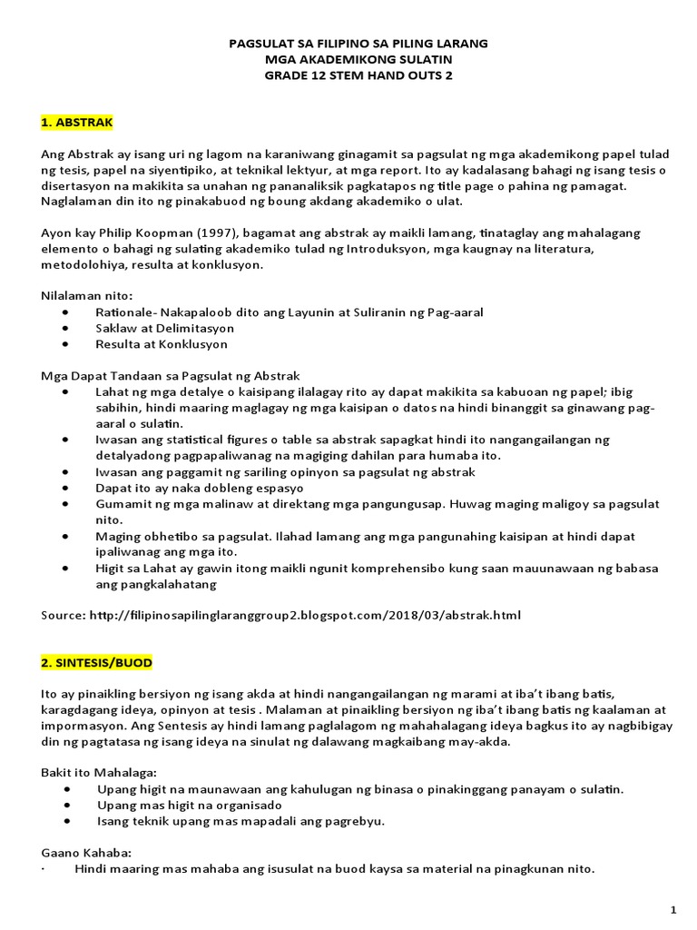 ABSTRAK Ay isang uri ng lagom na karaniwang ginagamit sa pagsulat ng mga akademikong papel tulad ng tesis papel na siyentipiko at teknikal lektyur at mga report. Nakasulat dito ang mahahalagang bahagi. Pagsasamang ibat ibang akda upang makabuo ng isang akda nakapag-ugnay.